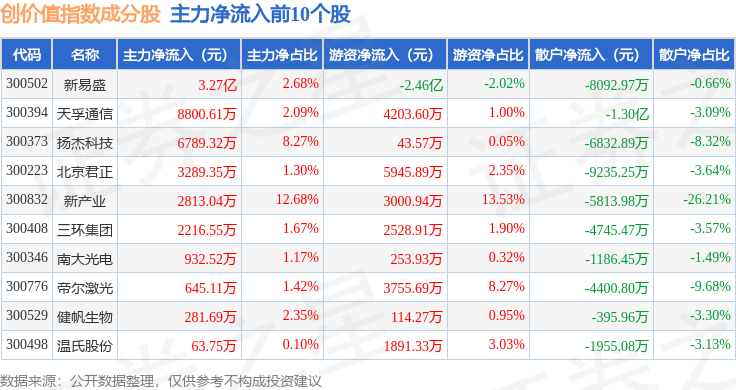 资金流向方面,创价值(399295)指数成份股当日主力资金净流出合计75.7亿元,游资资金净流入合计23.17亿元,散户资金净流入合计52.53亿元。成份股资金流向详情见下表: