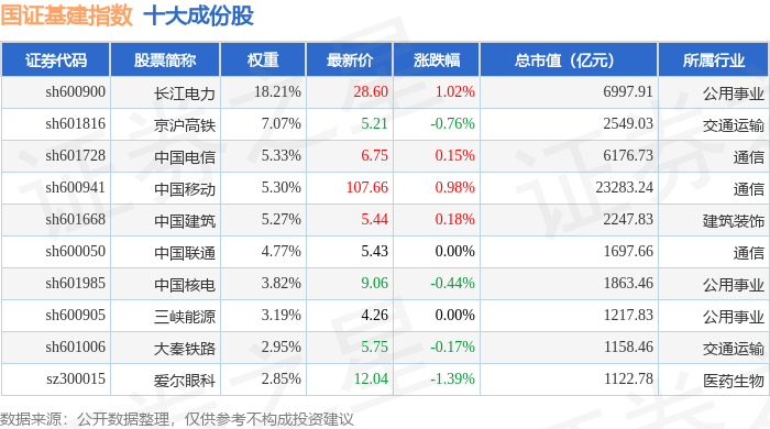 证券之星消息,11月4日,国证基建(399359)指数报收于2738.7点,涨0.05%,成交251.54亿元,换手率0.47%。当日该指数成份股中,上涨的有17家,宁沪高速以1.54%的涨幅领涨,下跌的有29家,中国核建以2.92%的跌幅领跌。