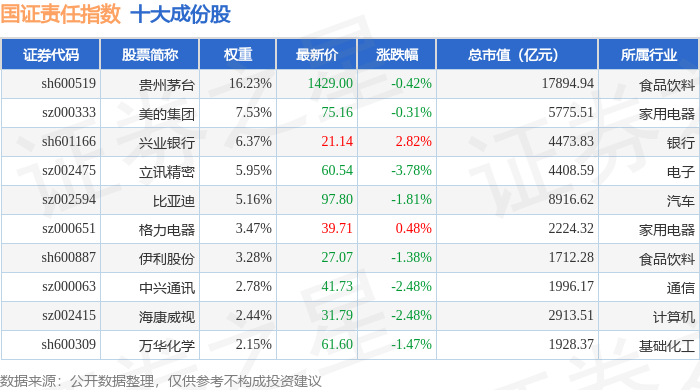 证券之星消息,11月4日,国证责任(399369)指数报收于1537.62点,跌0.77%,成交897.77亿元,换手率0.89%。当日该指数成份股中,上涨的有22家,兴业银行以2.82%的涨幅领涨,下跌的有72家,百洋医药以6.08%的跌幅领跌。