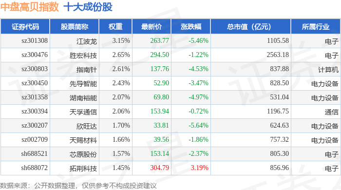 中盘高贝(399407)指数十大成份股详情如下:
