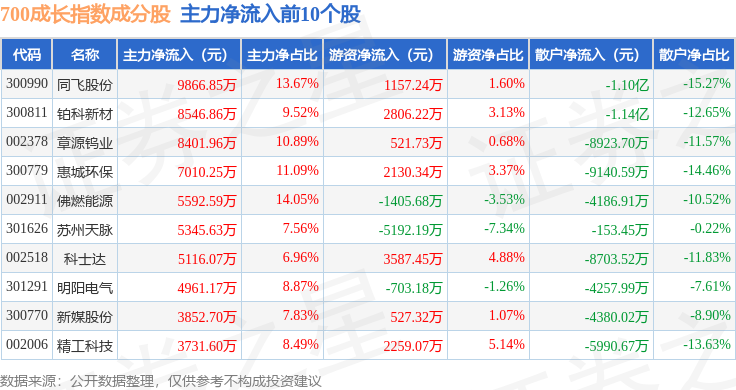 资金流向方面,700成长(399628)指数成份股当日主力资金净流出合计54.52亿元,游资资金净流入合计11.62亿元,散户资金净流入合计42.9亿元。成份股资金流向详情见下表: