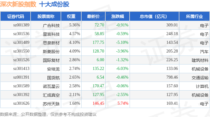证券之星消息,11月4日,深次新股(399678)指数报收于575.17点,跌1.38%,成交133.72亿元,换手率3.92%。当日该指数成份股中,上涨的有26家,美信科技以9.13%的涨幅领涨,下跌的有74家,宏工科技以6.9%的跌幅领跌。