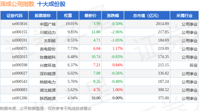 证券之星消息,11月4日,深成公用(399689)指数报收于881.36点,跌0.44%,成交40.19亿元,换手率0.7%。当日该指数成份股中,上涨的有6家,龙源电力以1.24%的涨幅领涨,下跌的有9家,川能动力以2.96%的跌幅领跌。
