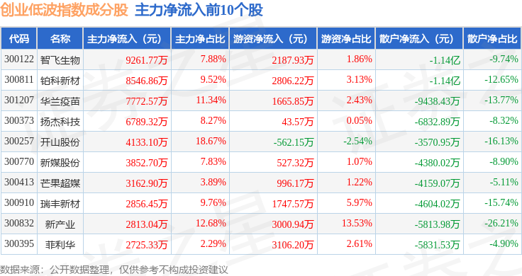 资金流向方面,创业低波(399692)指数成份股当日主力资金净流出合计24.33亿元,游资资金净流入合计11.53亿元,散户资金净流入合计12.8亿元。成份股资金流向详情见下表: