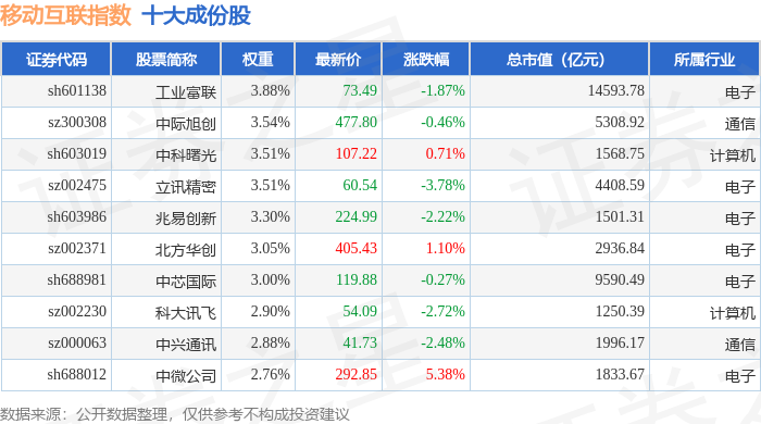 证券之星消息,11月4日,移动互联(399970)指数报收于4511.0点,跌1.37%,成交1901.06亿元,换手率2.51%。当日该指数成份股中,上涨的有17家,中微公司以5.38%的涨幅领涨,下跌的有83家,信维通信以5.7%的跌幅领跌。