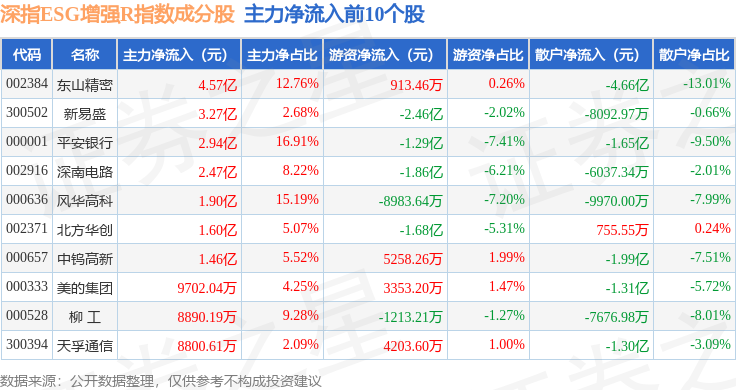 资金流向方面,深指ESG增强R(470032)指数成份股当日主力资金净流出合计202.04亿元,游资资金净流入合计46.81亿元,散户资金净流入合计155.23亿元。成份股资金流向详情见下表: