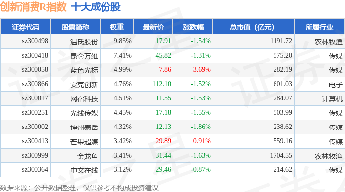 创新消费R(470041)指数十大成份股详情如下: