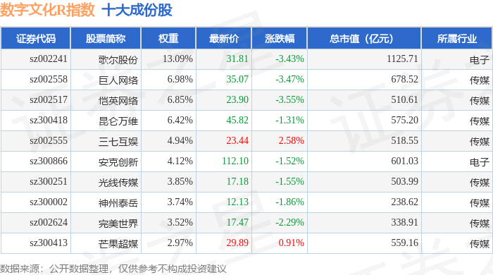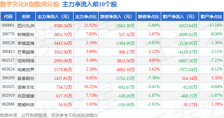 资金流向方面,数字文化R(470047)指数成份股当日主力资金净流出合计17.29亿元,游资资金净流入合计1.77亿元,散户资金净流入合计15.52亿元。成份股资金流向详情见下表: