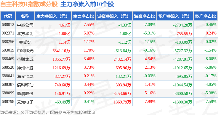 资金流向方面,自主科技R(480033)指数成份股当日主力资金净流出合计50.63亿元,游资资金净流入合计16.36亿元,散户资金净流入合计34.26亿元。成份股资金流向详情见下表: