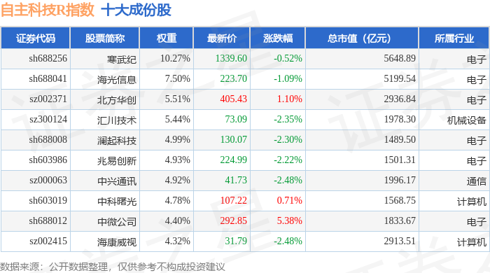 证券之星消息,11月4日,自主科技R(480033)指数报收于10183.18点,跌1.36%,成交827.18亿元,换手率1.64%。当日该指数成份股中,上涨的有4家,中微公司以5.38%的涨幅领涨,下跌的有46家,神州细胞以5.55%的跌幅领跌。