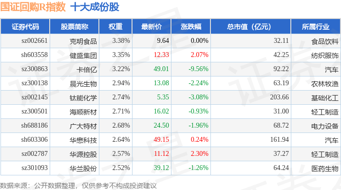 证券之星消息,11月4日,国证回购R(480063)指数报收于3954.64点,跌0.72%,成交142.77亿元,换手率1.5%。当日该指数成份股中,上涨的有15家,万泽股份以6.24%的涨幅领涨,下跌的有32家,卡倍亿以9.56%的跌幅领跌。