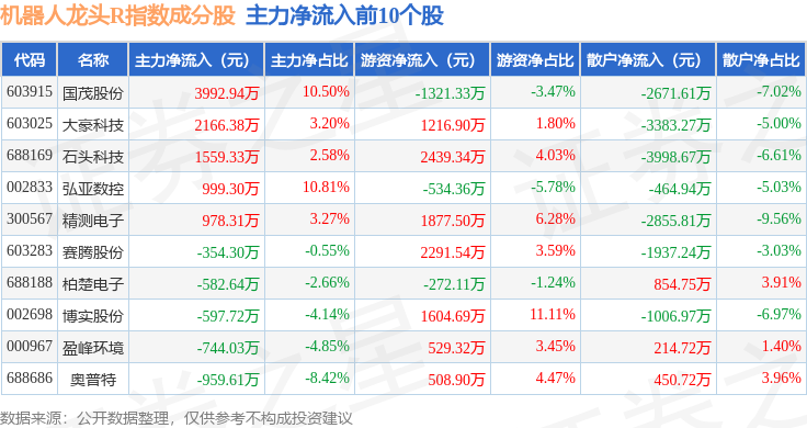 资金流向方面,机器人龙头R(480071)指数成份股当日主力资金净流出合计46.43亿元,游资资金净流入合计12.61亿元,散户资金净流入合计33.81亿元。成份股资金流向详情见下表: