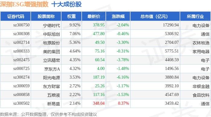 资金流向方面,深指ESG增强(970032)指数成份股当日主力资金净流出合计202.04亿元,游资资金净流入合计46.81亿元,散户资金净流入合计155.23亿元。成份股资金流向详情见下表: