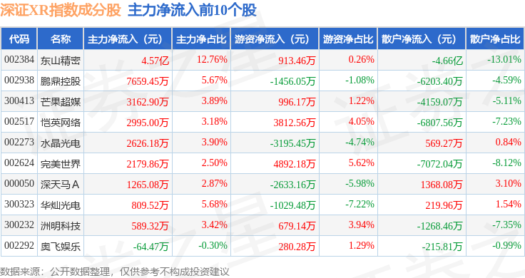 资金流向方面,深证XR(970046)指数成份股当日主力资金净流出合计40.28亿元,游资资金净流入合计5.64亿元,散户资金净流入合计34.64亿元。成份股资金流向详情见下表:
