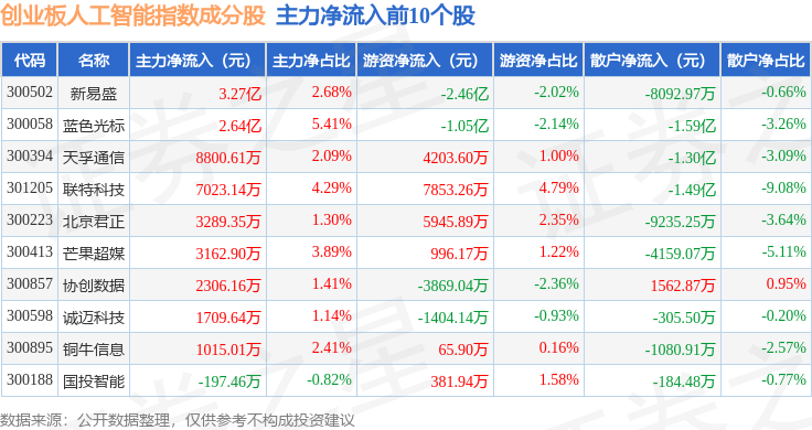 资金流向方面,创业板人工智能(970070)指数成份股当日主力资金净流出合计24.97亿元,游资资金净流入合计8.6亿元,散户资金净流入合计16.37亿元。成份股资金流向详情见下表: