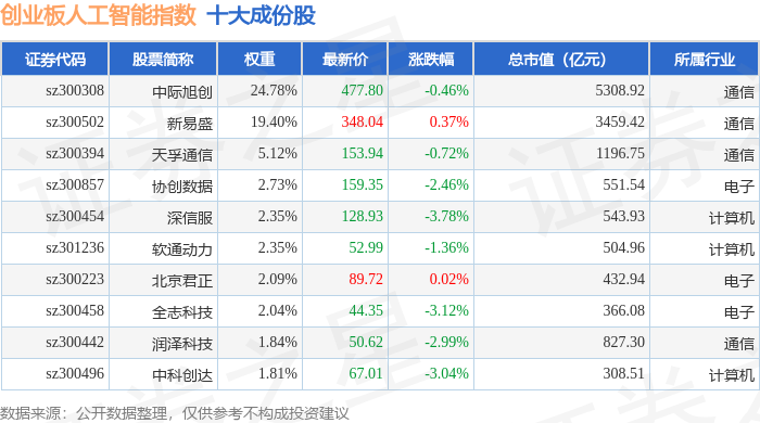证券之星消息,11月4日,创业板人工智能(970070)指数报收于5205.46点,跌0.89%,成交779.88亿元,换手率4.9%。当日该指数成份股中,上涨的有9家,蓝色光标以3.69%的涨幅领涨,下跌的有41家,东土科技以6.03%的跌幅领跌。