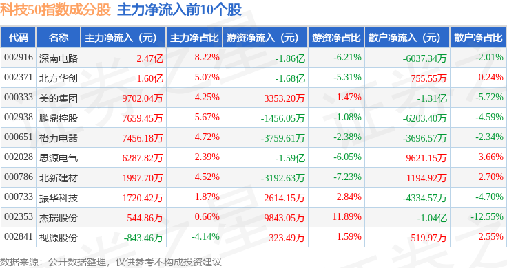 资金流向方面,科技50(970080)指数成份股当日主力资金净流出合计128.96亿元,游资资金净流入合计32.18亿元,散户资金净流入合计96.78亿元。成份股资金流向详情见下表: