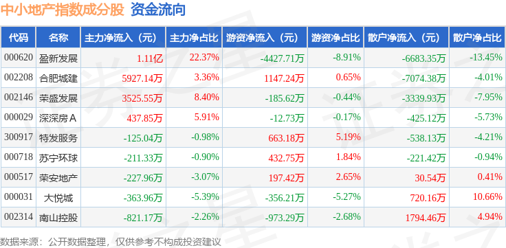 资金流向方面,中小地产(971002)指数成份股当日主力资金净流入合计1.93亿元,游资资金净流出合计3514.97万元,散户资金净流出合计1.57亿元。成份股资金流向详情见下表: