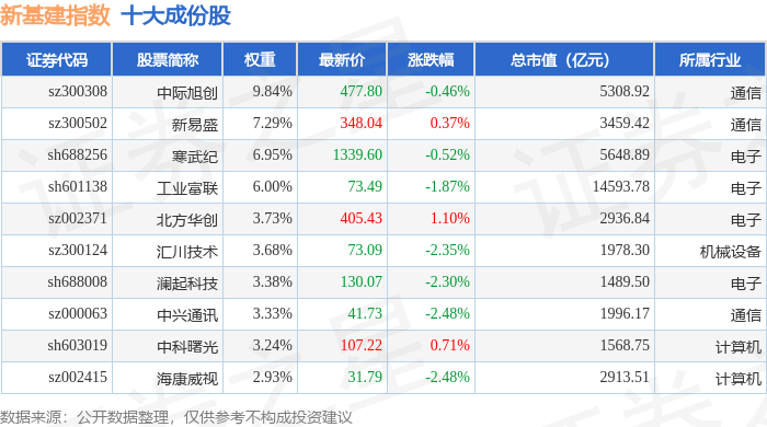 证券之星消息,11月4日,新基建(980029)指数报收于7201.35点,跌0.79%,成交1447.12亿元,换手率1.25%。当日该指数成份股中,上涨的有12家,思源电气以5.07%的涨幅领涨,下跌的有36家,深信服以3.78%的跌幅领跌。