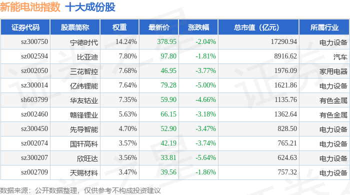 资金流向方面,新能电池(980032)指数成份股当日主力资金净流出合计100.44亿元,游资资金净流入合计19.46亿元,散户资金净流入合计80.98亿元。成份股资金流向详情见下表: