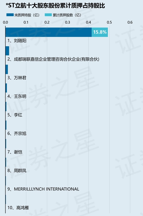 截止本公告日,股东刘随阳已累计质押股份780.0万股,占其持股总数的15.8%。本次质押后*ST立航十大股东的累计质押股份占持股比例(占持股比例的计算以公司最新一期财务报表公布的十大股东的持股总数为基准)见下图: