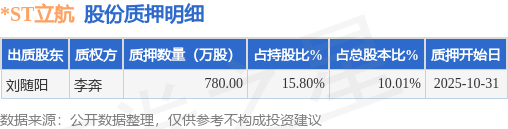 证券之星消息,*ST立航(603261)11月4日公开信息显示,股东刘随阳向李奔合计质押780.0万股,占总股本10.01%。质押详情见下表: