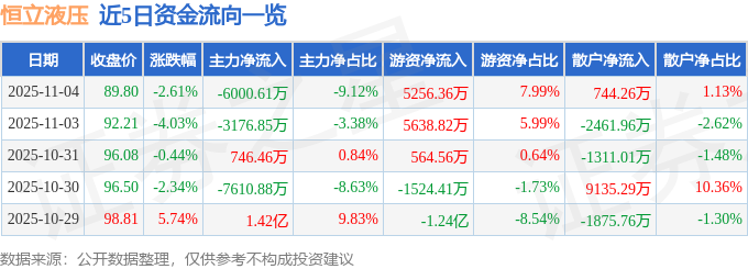 证券之星消息,截至2025年11月4日收盘,恒立液压(601100)报收于89.8元,下跌2.61%,换手率0.54%,成交量7.27万手,成交额6.58亿元。