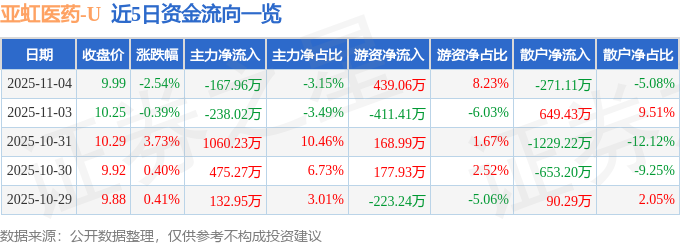 证券之星消息,截至2025年11月4日收盘,亚虹医药(688176)报收于9.99元,下跌2.54%,换手率1.22%,成交量5.31万手,成交额5337.27万元。