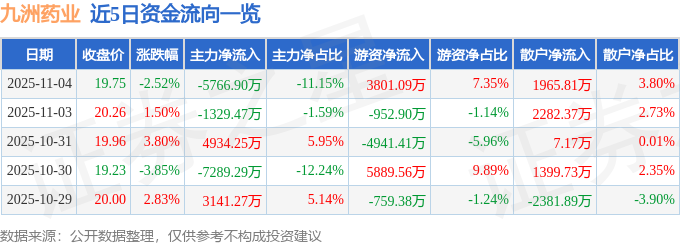 证券之星消息,截至2025年11月4日收盘,九洲药业(603456)报收于19.75元,下跌2.52%,换手率2.93%,成交量26.1万手,成交额5.17亿元。