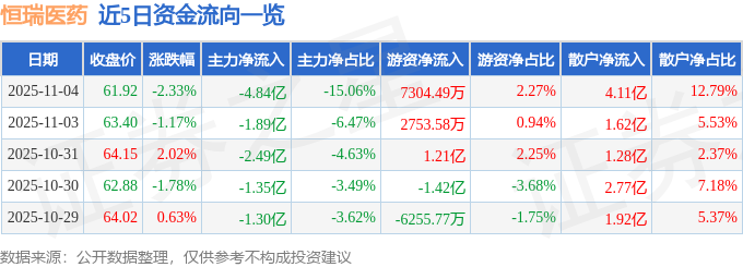 证券之星消息,截至2025年11月4日收盘,恒瑞医药(600276)报收于61.92元,下跌2.33%,换手率0.81%,成交量51.56万手,成交额32.16亿元。