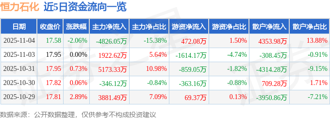 证券之星消息,截至2025年11月4日收盘,恒力石化(600346)报收于17.58元,下跌2.06%,换手率0.25%,成交量17.73万手,成交额3.14亿元。