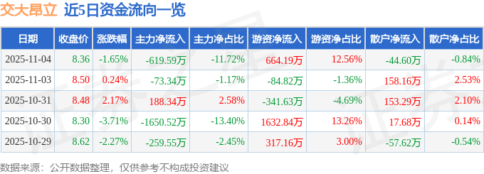证券之星消息,截至2025年11月4日收盘,交大昂立(600530)报收于8.36元,下跌1.65%,换手率0.81%,成交量6.3万手,成交额5286.1万元。