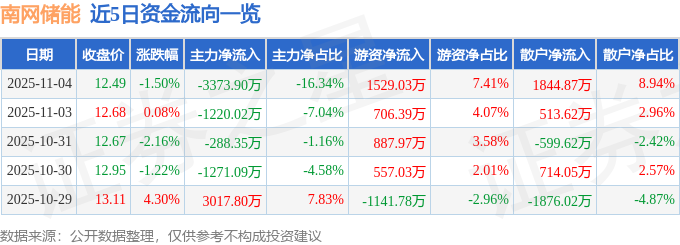 证券之星消息,截至2025年11月4日收盘,南网储能(600995)报收于12.49元,下跌1.5%,换手率0.51%,成交量16.34万手,成交额2.06亿元。