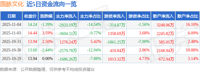 证券之星消息,截至2025年11月4日收盘,国脉文化(600640)报收于14.24元,下跌1.39%,换手率1.79%,成交量14.23万手,成交额2.02亿元。