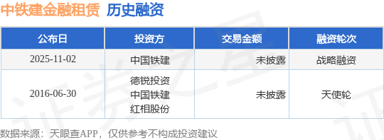 证券之星消息,根据天眼查APP于11月2日公布的信息整理,中铁建金融租赁有限公司战略融资,融资额未披露,参与投资的机构包括中国铁建。