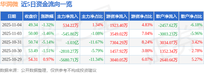 证券之星消息,截至2025年11月4日收盘,华润微(688396)报收于49.34元,下跌1.32%,换手率0.6%,成交量8.02万手,成交额3.98亿元。