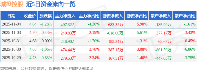 证券之星消息,截至2025年11月4日收盘,城投控股(600649)报收于4.64元,下跌1.28%,换手率0.99%,成交量24.85万手,成交额1.16亿元。