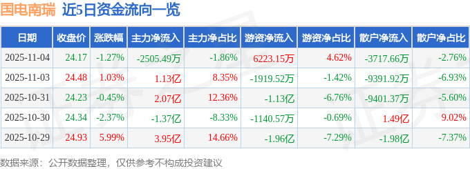 证券之星消息,截至2025年11月4日收盘,国电南瑞(600406)报收于24.17元,下跌1.27%,换手率0.69%,成交量54.85万手,成交额13.46亿元。
