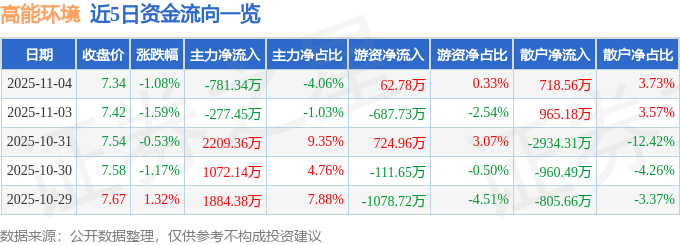证券之星消息,截至2025年11月4日收盘,高能环境(603588)报收于7.34元,下跌1.08%,换手率1.72%,成交量26.14万手,成交额1.93亿元。