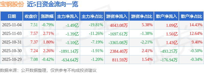 证券之星消息,截至2025年11月4日收盘,宝钢股份(600019)报收于7.51元,下跌0.79%,换手率0.46%,成交量99.43万手,成交额7.52亿元。