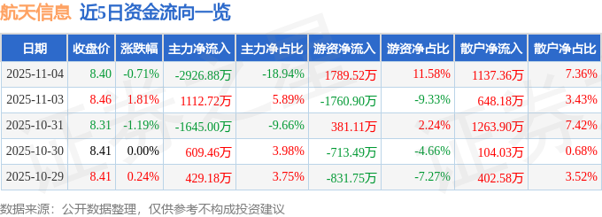 证券之星消息,截至2025年11月4日收盘,航天信息(600271)报收于8.4元,下跌0.71%,换手率0.99%,成交量18.39万手,成交额1.55亿元。