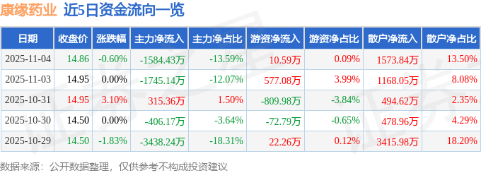 11月4日的资金流向数据方面,主力资金净流出1584.43万元,占总成交额13.59%,游资资金净流入10.59万元,占总成交额0.09%,散户资金净流入1573.84万元,占总成交额13.5%。