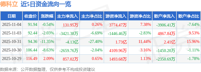 证券之星消息,截至2025年11月4日收盘,德科立(688205)报收于91.94元,下跌0.54%,换手率3.48%,成交量5.51万手,成交额5.11亿元。