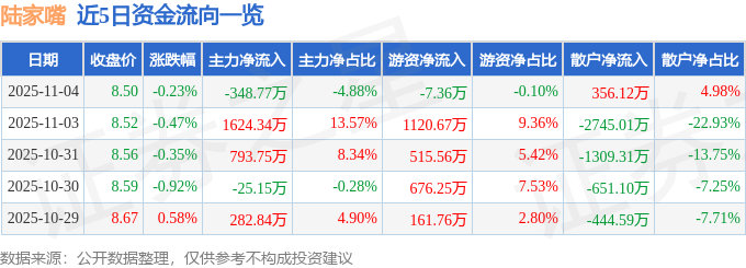 证券之星消息,截至2025年11月4日收盘,陆家嘴(600663)报收于8.5元,下跌0.23%,换手率0.27%,成交量8.4万手,成交额7151.48万元。