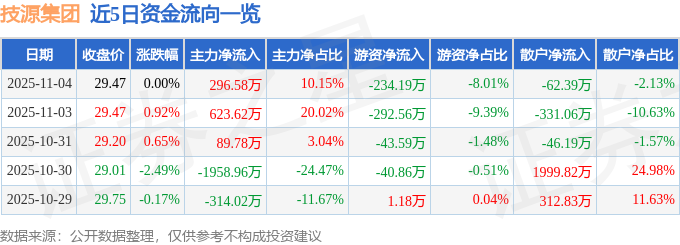 11月4日的资金流向数据方面,主力资金净流入296.58万元,占总成交额10.15%,游资资金净流出234.19万元,占总成交额8.01%,散户资金净流出62.39万元,占总成交额2.13%。