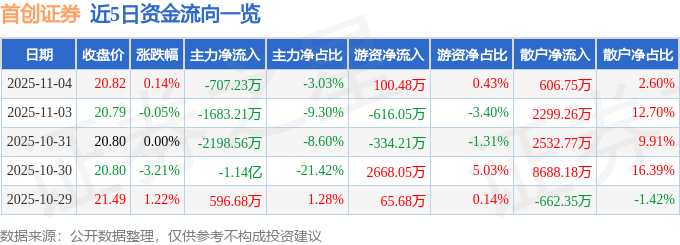 证券之星消息,截至2025年11月4日收盘,首创证券(601136)报收于20.82元,上涨0.14%,换手率2.32%,成交量11.17万手,成交额2.33亿元。