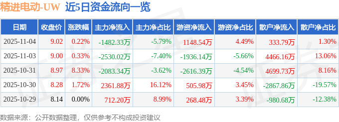 证券之星消息,截至2025年11月4日收盘,精进电动(688280)报收于9.02元,上涨0.22%,换手率5.37%,成交量27.96万手,成交额2.56亿元。