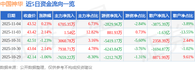 证券之星消息,截至2025年11月4日收盘,中国神华(601088)报收于43.52元,上涨0.23%,换手率0.14%,成交量22.82万手,成交额9.96亿元。