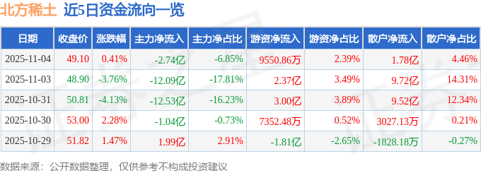 证券之星消息,截至2025年11月4日收盘,北方稀土(600111)报收于49.1元,上涨0.41%,换手率2.25%,成交量81.32万手,成交额39.97亿元。