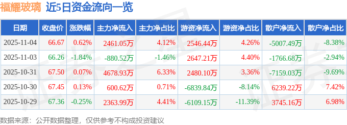证券之星消息,截至2025年11月4日收盘,福耀玻璃(600660)报收于66.67元,上涨0.62%,换手率0.45%,成交量8.96万手,成交额5.97亿元。